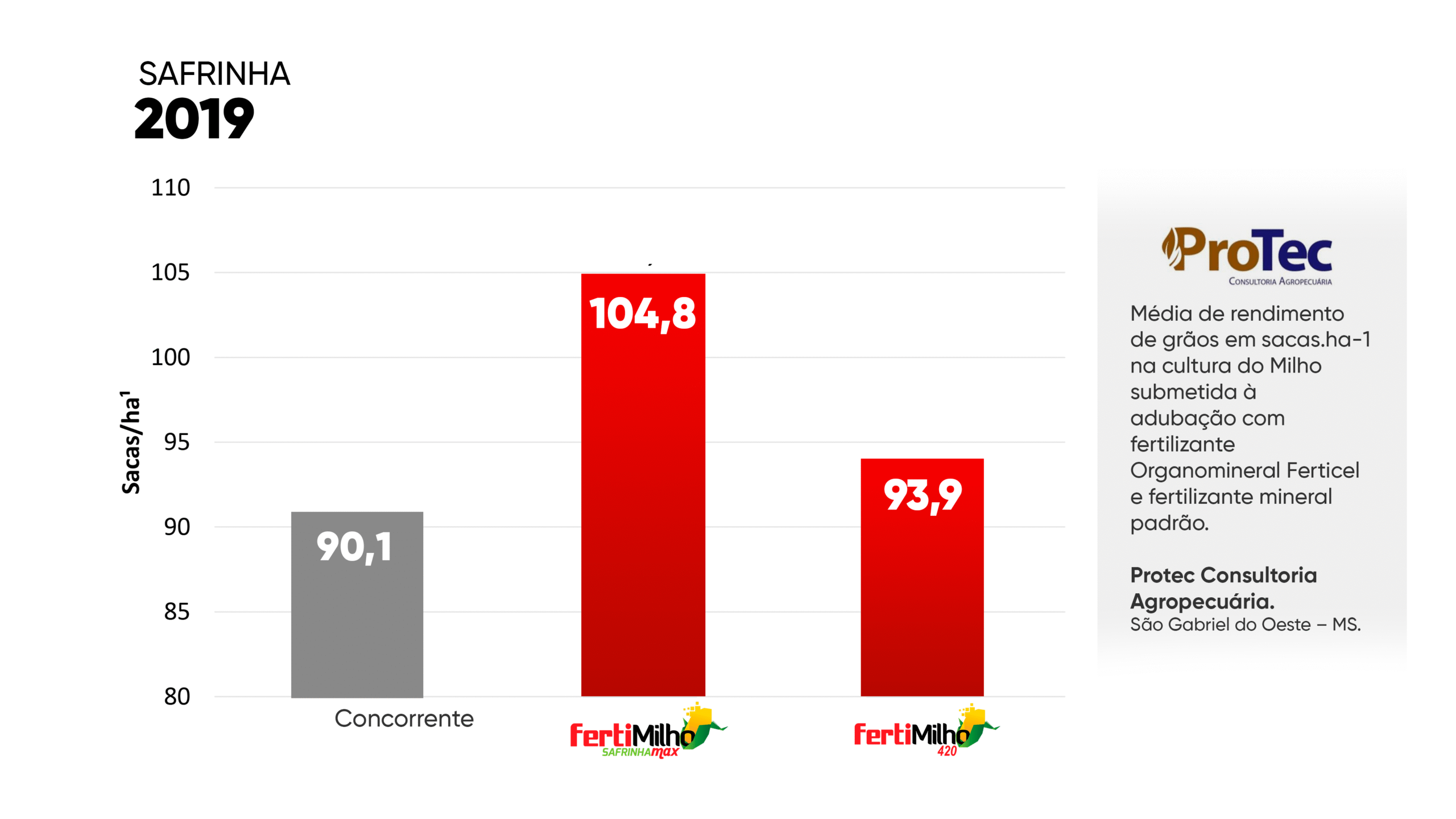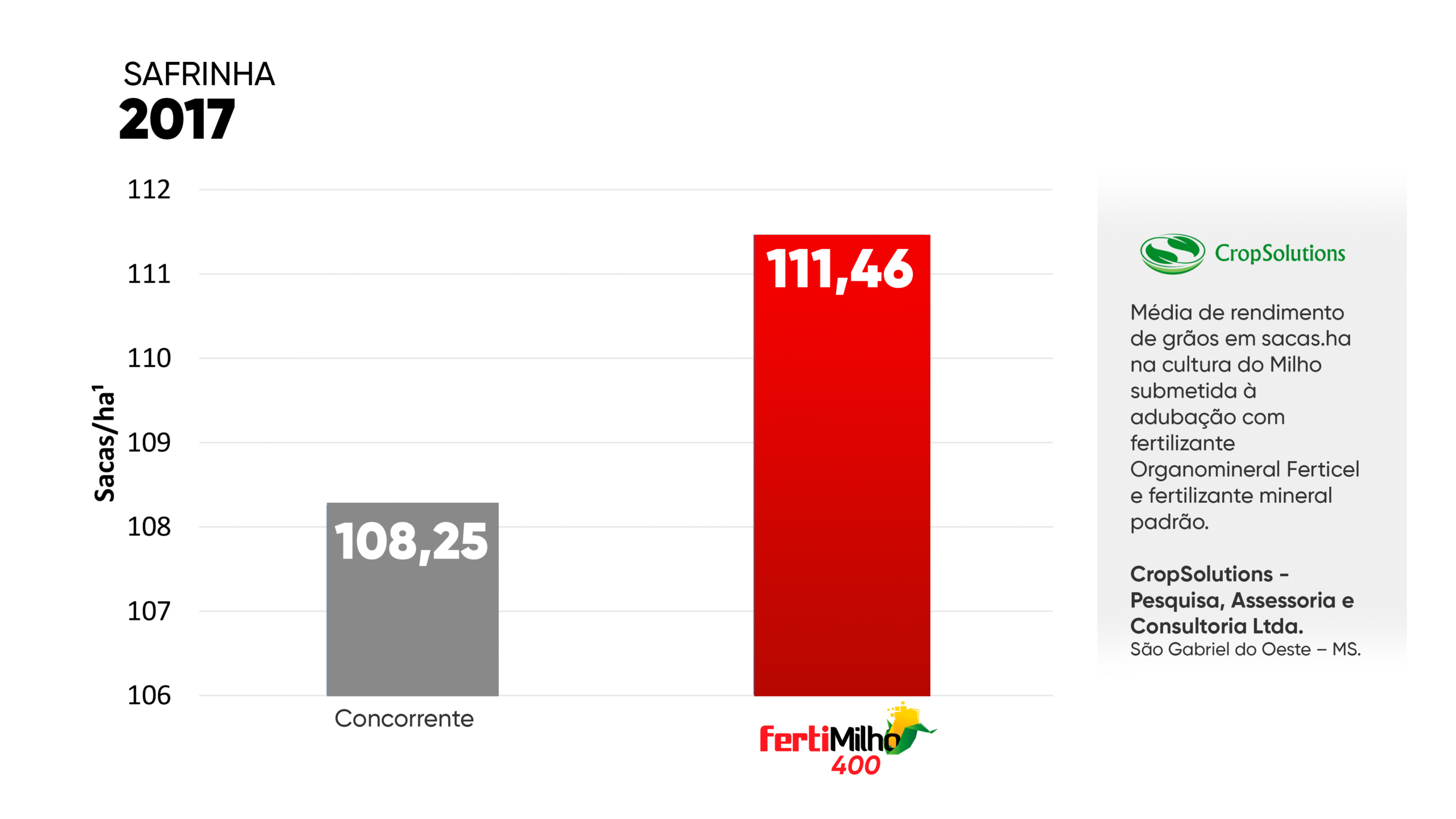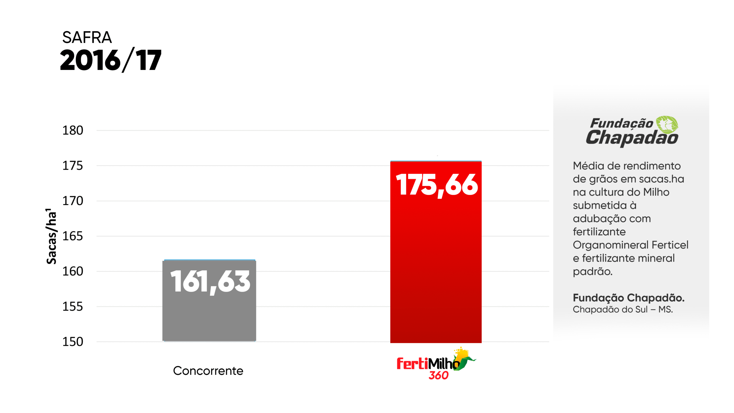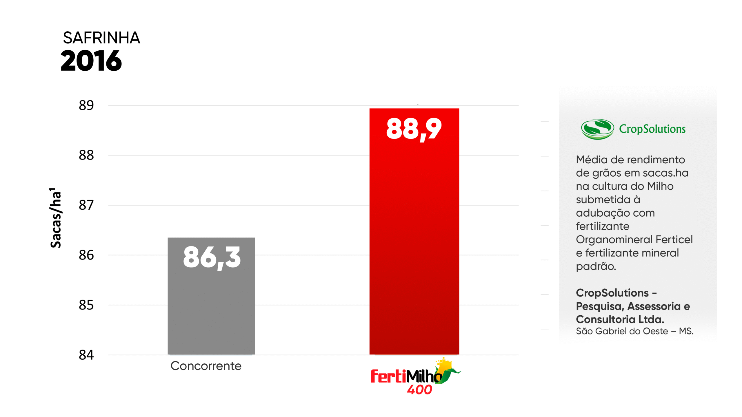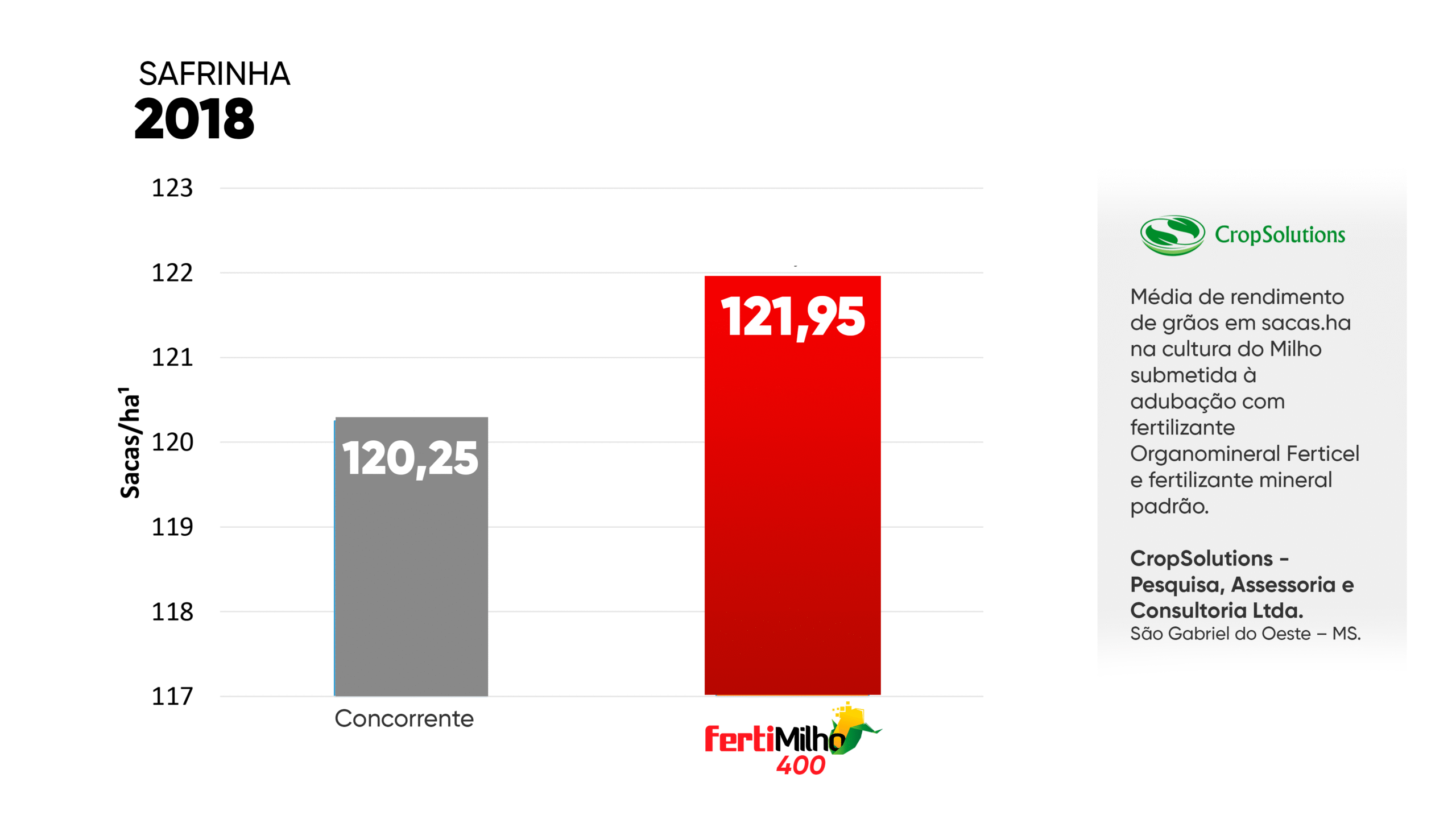 Os nutrientes N, P K Ca, Mg, S, Fe, B, Zn, Mn, Cu e Co estão cobertos pela matéria orgânica, na qual sua liberação ocorre gradativamente, conforme a necessidade da cultura e evitando perdas. Pensando em eficiência, o FertiMilho é muito mais que um fertilizante. Isto porque, o maior aproveitamento de nutrientes (como o P), o índice salino reduzido (devido a liberação lenta de K), a alta concentração de Ácidos Húmicos e Fúlvicos, e a elevada concentração de Carbono orgânico e MO, proporcionando CTC elevada e incremento no pH favorecem o desenvolvimento radicular e diminuem efeitos de estresses. Essas características do FertiMilho promovem o desenvolvimento saudável da planta, melhorando os teores bromatológicos, fazendo com que ele se destaque em produtividade na cultura.